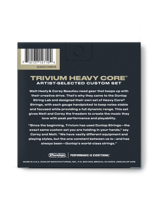 Matt Heafy i Corey Beaulieu iz Triviuma trebaju opremu koja prati njihov kreativni pogon. Zato su došli u Dunlop String Lab i dizajnirali vlastiti set Heavy Core® žica, pri čemu je svaka debljina ručno odabrana kako bi note bile stabilne i fokusirane na nižim štimovima, a istovremeno nudile puni dinamički raspon koji je uravnotežen sa živopisnim visokim i bogatim niskim tonovima. Ovaj set daje Mattu i Coreyju slobodu stvaranja glazbe koju vole uz vrhunske performanse i svirljivost.